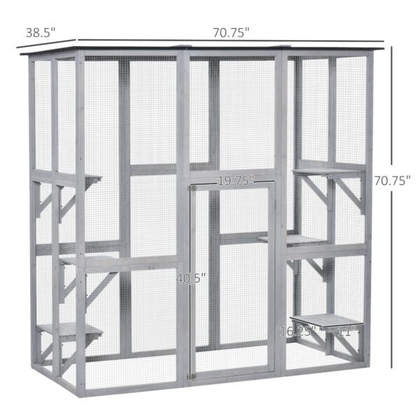 Check out our amazing outdoor cat cage from Catface! Allow your pet to enjoy the great outdoors without the danger of roaming free. Built on a robust wood frame that has been sealed with a pet-friendly, sealant, and fully enclosed with a stable wire mesh allowing your pet to be outside, without wandering freely. 6 platforms allow for your pet to climb and lounge when inside. The flat roof has been covered with asphalt to help with weather protection.